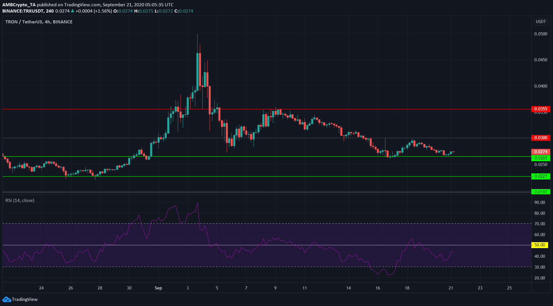 TRX, Eylül ayının başından bu yana düşüş trendi içinde ve kripto, 0,3 $ ‘lık direnç bölgesini test etmek için 0,265 $’ dan destek gördü. Orada reddedildi, ardından TRX aynı desteği bir kez daha test etti.