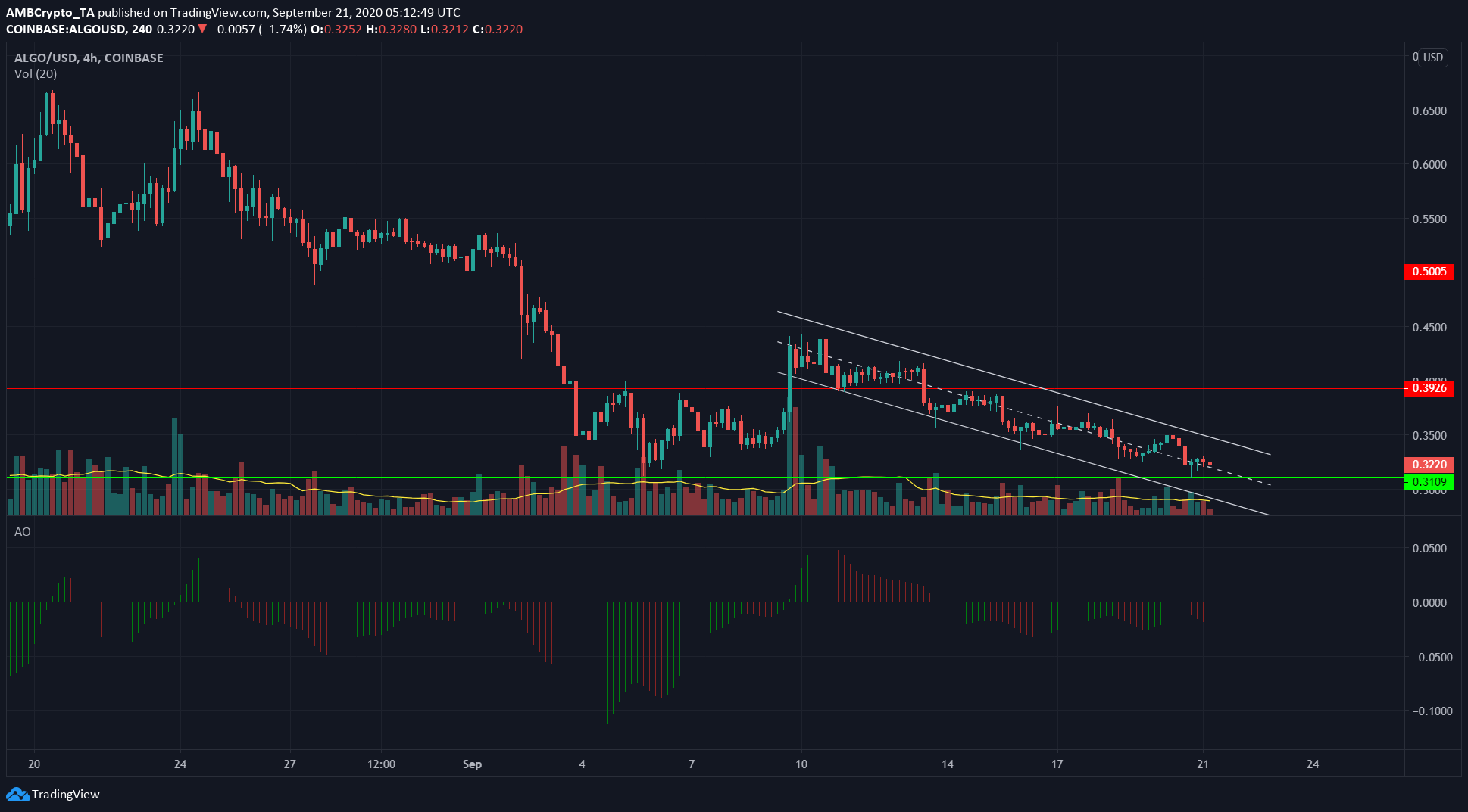 ALGO, 0,31 dolarlık destek seviyesine doğru azalan bir kanalda ilerliyordu. Alım satım hacmi, ALGO’nun 0,39 $ ‘lık direncini aştığı alım satım seansları hariç, son zamanlarda oldukça istikrarlı.