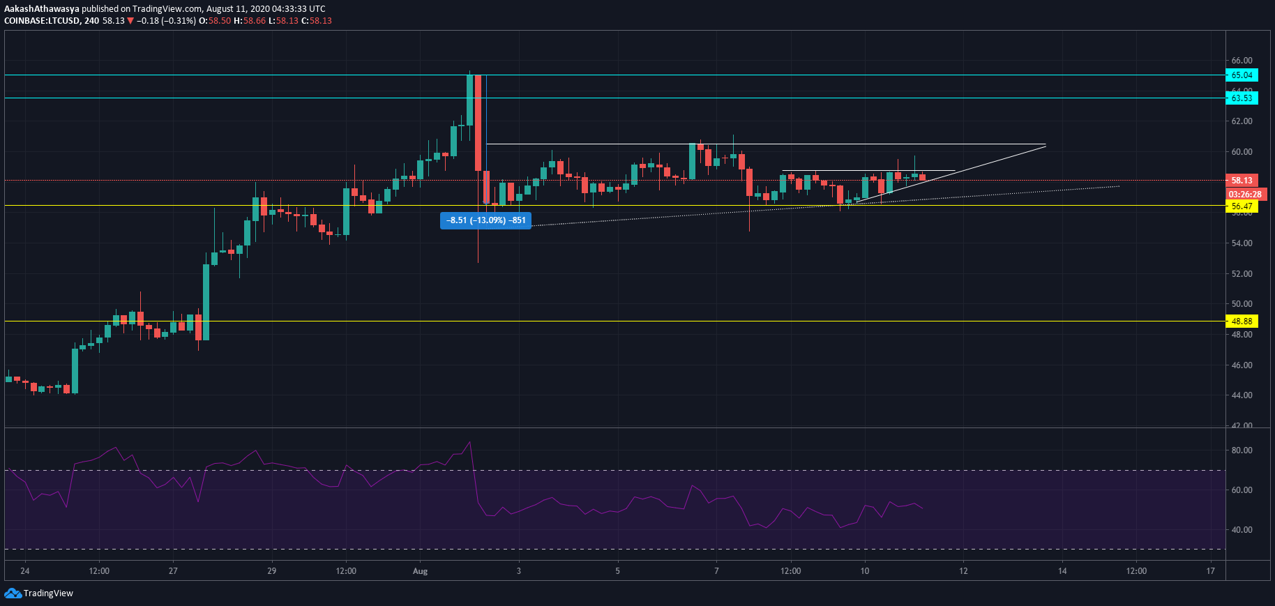 Direnç seviyelerinden bahsetmişken, geçen hafta yükselen iki üçgende işlem gören Litecoin için üst direnç 60,51 $ ‘da güçlü. Direnç ve düşük seviyelerde sabit yükselmelerle, şimdi fiyatın artması, ikinci yükselen üçgende sıkışıp kalacaktır.
