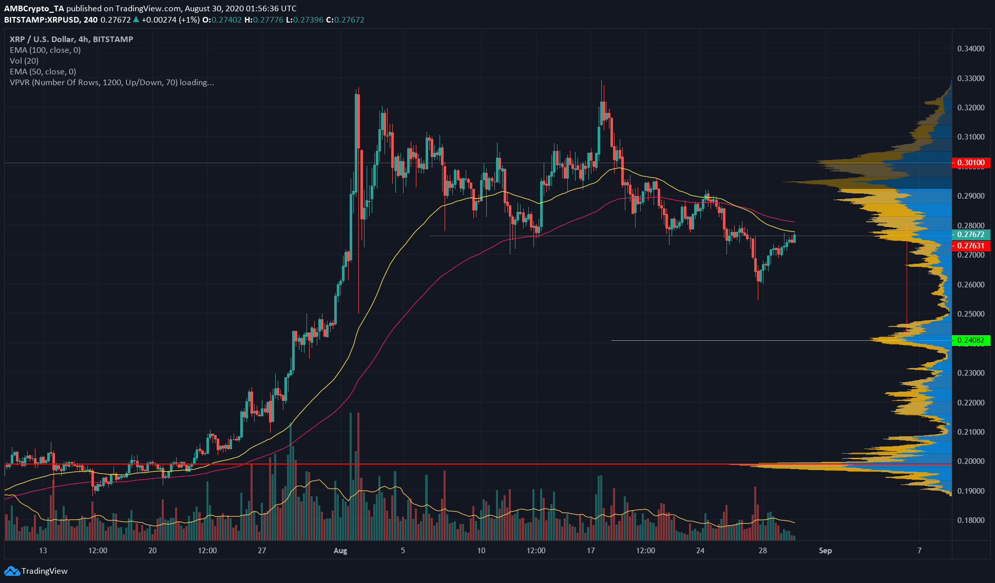 XRP, VPVR’nin vurguladığı gibi önemli bir seviyede işlem görüyordu. 0,276 $ ve üzerindeki bölge, önemli XRP ticareti gördü. XRP bu seviyenin üzerine çıkmazsa 0,24 $ ‘a düşebilir .