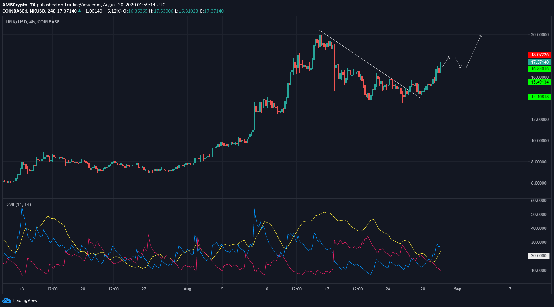 18 dolar psikolojik bir dirençtir. LINK’in 18 $ ‘ı geçmesi olasıdır veya 16.8 $’ ı yeniden test etmek ve direnci kırmak için başka bir girişimde bulunmak için reddedilebilir.
