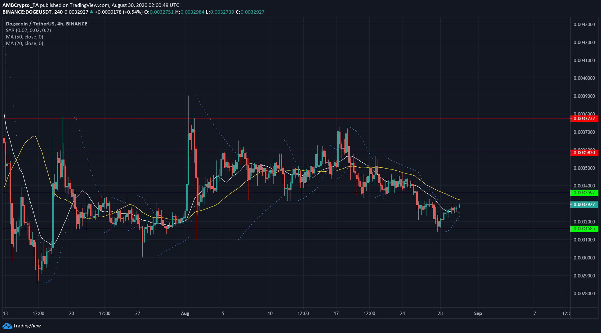 DOGE , baskı anında 0.00311 $ ‘dan destek alarak 0.00329 $’ dan işlem gördü. Bununla birlikte, 20 SMA (beyaz), kısa vadeli düşüşün kaldığını gösteren 50 SMA’nın (sarı) altındaydı.